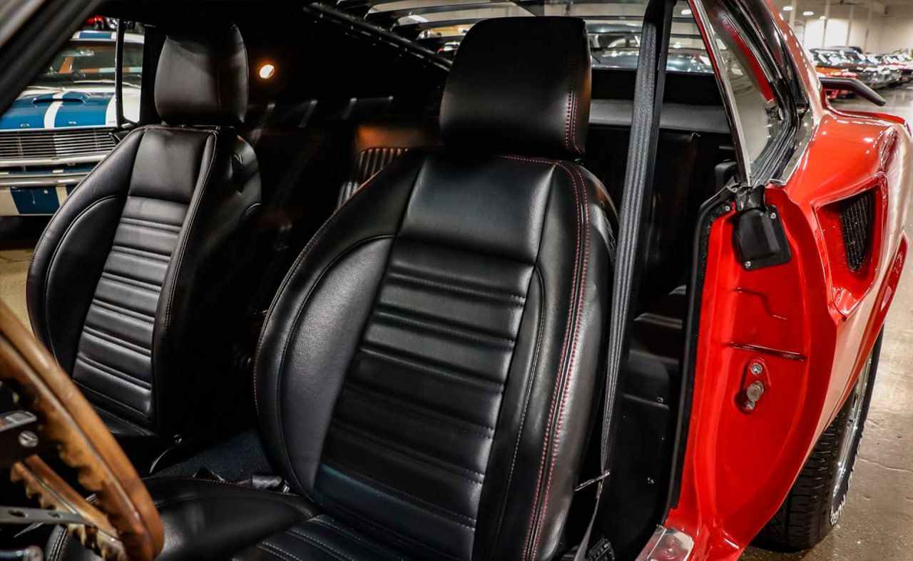 Step inside the cabin, and you'll be greeted by a sleek black interior that perfectly complements the red exterior. The classic styling continues with comfortable black leather seats, offering a combination of luxury and sportiness. The attention to detail is evident throughout the interior, with chrome accents and a well-designed dashboard that showcases the Mustang's heritage.