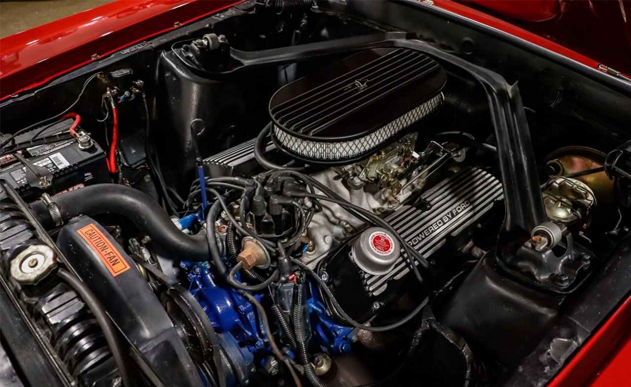 The exterior of this classic beauty is finished in a stunning shade of red, which not only accentuates the car's aggressive lines but also adds a touch of sophistication and elegance. The iconic Mustang silhouette, featuring a sloping fastback roofline, gives this car a distinctive and timeless appeal that never goes out of style.